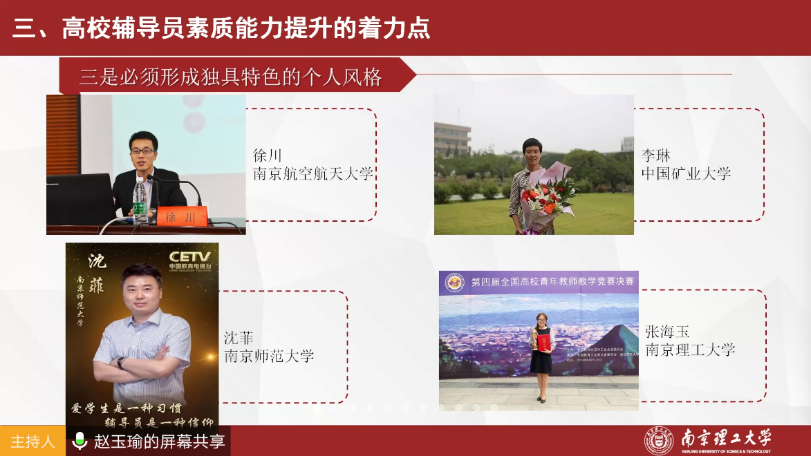 4月15日,红山学院组织开展线上“辅导员工作坊”活动,邀请南京理工大学辅导员赵玉瑜与红山学院全体学工人员交流学生工作经验。活动由红山学院学生处处长陈燕主持,学院党委副书记高永东参加。