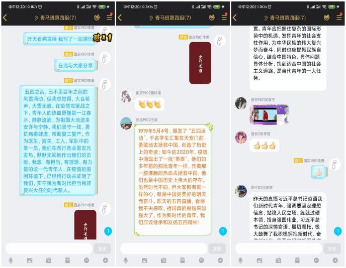 食安1801团支部的张婉婷同学在讨论中说道:“今天是五四青年节,看完五四特别主题团日活动,心潮澎湃。我们作为新一代的青年要将五四精神传承下去,不负党和国家的期望,勇担重任,在人民需要的地方发光发热。”