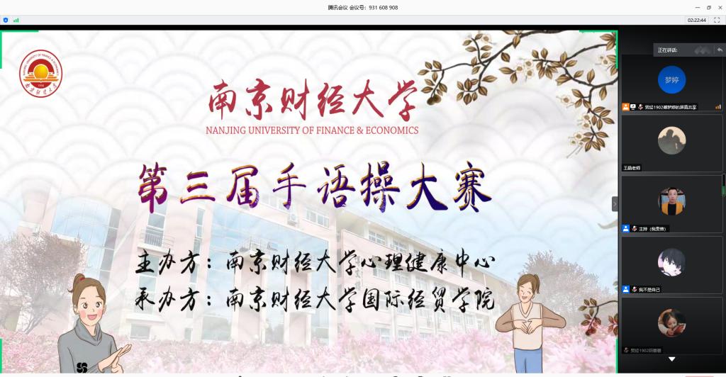6月9日晚,金年会第三届手语操大赛“手动舞出青春活力,抗疫宅家你我同行”在腾讯会议线上举行。比赛由学生处心理健康教育与咨询中心主办、国际经贸学院承办。南京师范大学心理中心老师王佳莹,金年会心理健康教育与咨询中心老师吴垠、吴琦担任评委。全校共有14支队伍参赛。