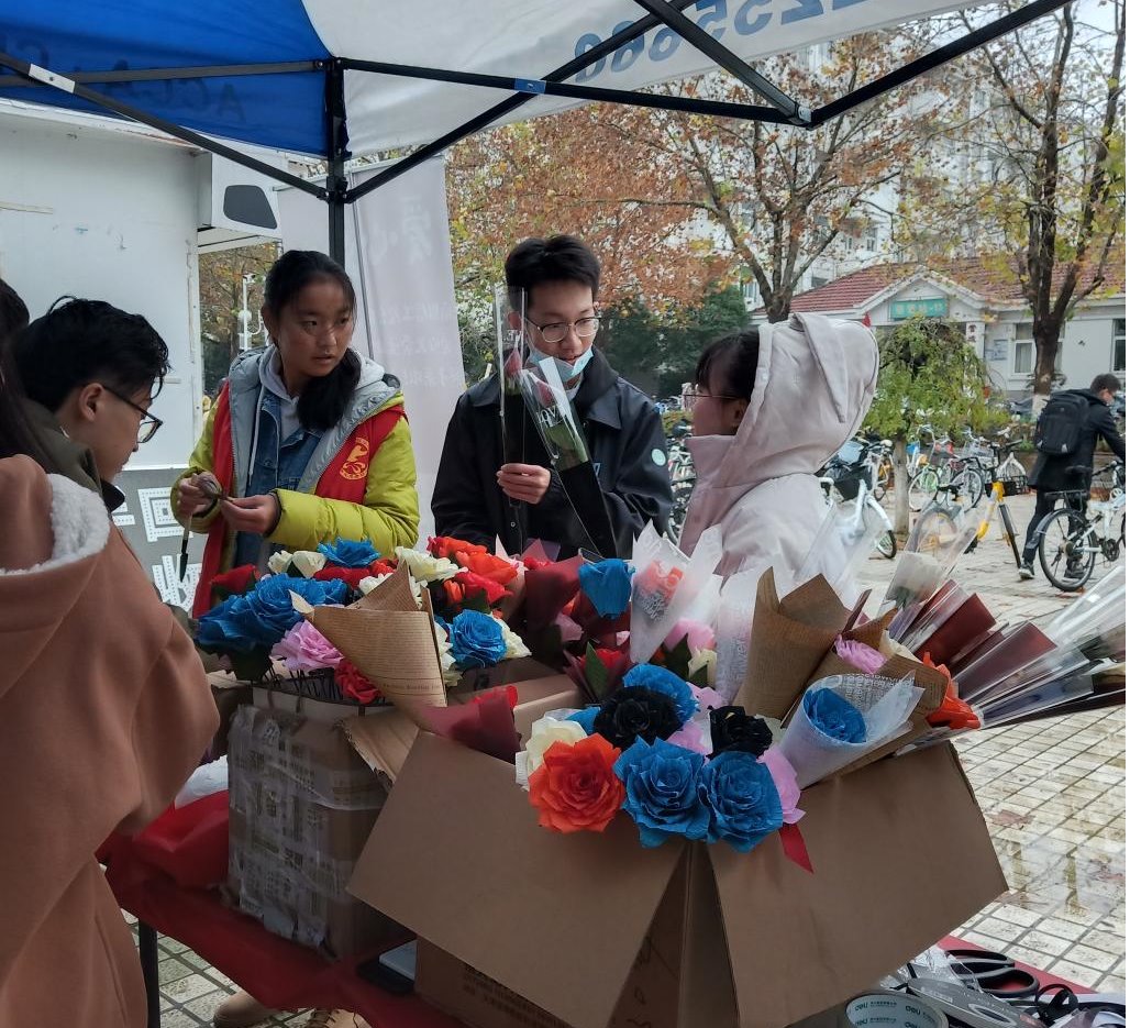 信息工程学院开展了“爱心义卖,爱的传递”活动,采用网络宣传和公益义卖的形式,将所筹集到的善款无偿捐赠,用于帮助黑龙江省佳木斯市的贫困儿童。在爱心义卖活动现场的帐篷里,工作人员穿好红色马甲整装待发,桌上摆放着芳香扑鼻还沾着新鲜露水的红玫瑰、环保美观的纸质玫瑰花、精美可爱的绿色小多肉等植物供同学们挑选。同学们听闻此次义卖活动的宗旨后,纷纷积极参与到活动中去,为困难地区的儿童献出一份爱心。“我想买一盆多肉!”“我要一束玫瑰!”接过工作人员精心包好的花束,同学们的脸上都露出了满足的笑容。“赠人玫瑰,手有余香,我们开展此次活动一方面是想锻炼自己的能力,但更重要的是用自己的实际活动将爱心传递下去。我们愿意用玫瑰搭建起爱心的桥梁,传递温暖!”志愿服务部部长耿同学如是说。