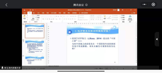 4月16日晚,应财政与税务学院、公共财政研究中心邀请,南开大学经济学院财政学系副主任、博导、中国财政学会理事、国家自然科学基金通讯评议专家、国家社会科学基金通讯鉴定专家郭玉清利用腾讯会议系统围绕“地方政府债务治理的制度导向与战略思考”主题作了学术报告。学院部分教师和研究生参加讲座。讲座由财税学院院长朱军主持。