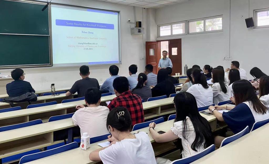 随后,张福保教授在仙林校区德业楼115作了题为“Some results for Kirchhoff problems”的学术讲座。应用数学学院相关教师和研究生参加了讲座。讲座由应用数学学院院长王宏勇主持。