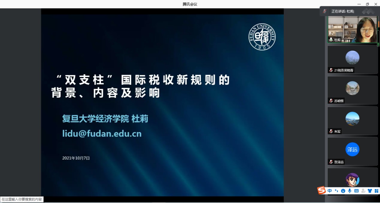 10月7日晚,应财政与税务学院、公共财政研究中心、中国财税治理研究院邀请,复旦大学经济学院公共经济研究中心执行主任、税务硕士专业学位项目学术负责人杜莉教授作了题为“‘双支柱’国际税收新规则的背景、内容及影响”的线上学术讲座。财政与税务学院部分教师和全体硕士研究生参加了讲座。