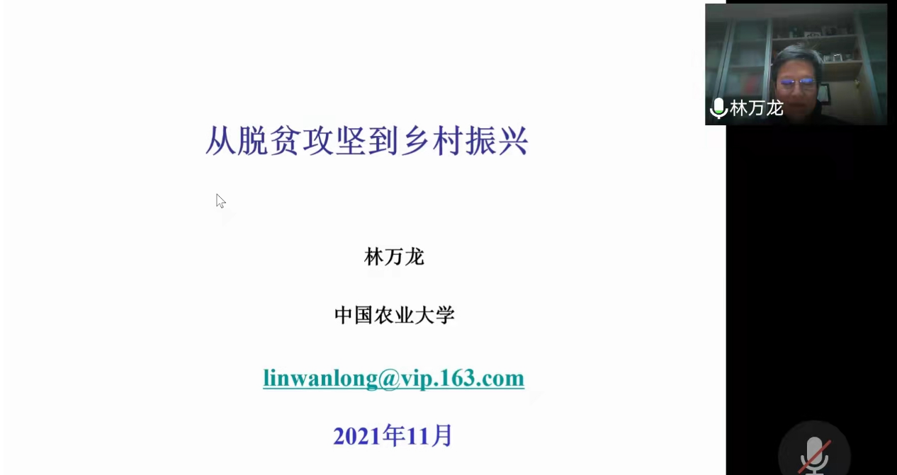 11月7日,应经济学院邀请,中国农业大学副校长林万龙教授为金年会师生作题为“从脱贫攻坚到乡村振兴”的学术报告。报告由经济学院院长朱红根主持。来自经济学院和全校其它学院的200多位老师和研究生线上聆听了讲座。