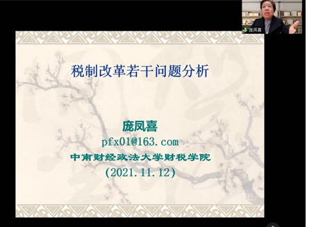 11月12日,应财政与税务学院、公共财政研究中心和中国财税治理研究院的邀请,中金年会经政法大学财政税务学院教授、博士生导师庞凤喜通过腾讯会议为金年会师生作了题为“财税国家项目选题要点:税制改革若干问题分析”的线上学术讲座。讲座由财政与税务学院院长、公共财政研究中心主任朱军主持,学院中青年教师、全体硕士研究生和部分本科生参加了本次讲座。