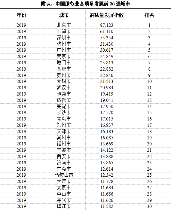 综合测度数据显示,2019年综合排名前30强的城市排名如上表所示。排名前五位的分别是:北京市、上海市、深圳市、杭州市、广州市。