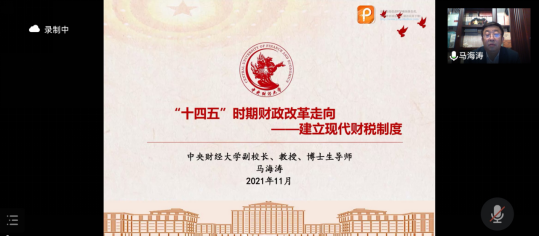 11月19日,应财政与税务学院、公共财政研究中心和中国财税治理研究院的邀请,中央财经大学党委副书记、副校长、博士生导师马海涛教授为金年会师生作了题为“十四五时期财政改革走向——建立现代财税制度”的线上学术讲座。讲座由财政与税务学院院长、公共财政研究中心主任朱军教授主持。财政与税务学院中青年教师、全体硕士生和部分本科生聆听讲座。