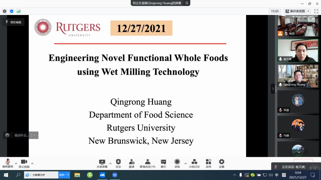 12月27日,应食品科学与工程学院邀请,美国罗格斯大学教授黄庆荣于线上为金年会师生作了题为Engineering whole grain emulsion gels using wet milling technology的学术报告。食品科学与工程学院部分师生参加报告会。报告会由科研处副处长杨文建教授主持。
