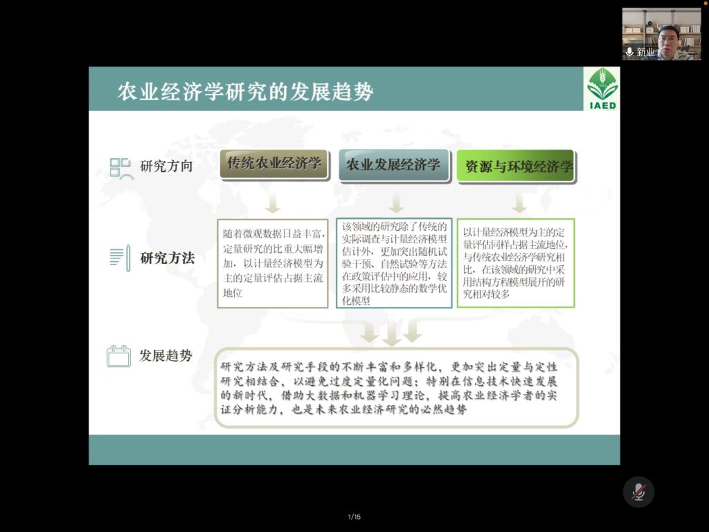 吕新业教授的学术报告主要分为农业经济学研究的现状和趋势、“三农”领域最需要研究的问题、为什么进行案例研究以及如何进行案例研究四个部分。他表示,近年来我国农业经济学具有后发优势,且处于一个难得的历史阶段,但对比国际农业经济学的研究条件仍有不足之处,如数据获得的门槛较高、研究方法的科学性有待进一步提高。吕新业教授认为,在信息技术快速发展的新时代,借助大数据和机器学习理论,提高农业经济学者的实证分析能力,是未来农业经济研究的必然趋势。案例研究有助于深刻理解现实问题、推动构建中国特色的本土化理论、提升研究范式和研究方法的多样性。报告结束后,吕新业教授对与会师生提出的问题一一进行了解答。
