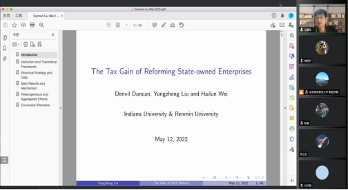 6月9日下午,应财政与税务学院、公共财政研究中心和中国财税治理研究院邀请,中国人民大学财政金融学院教授、博导、美国佐治亚州立大学经济学博士、国家级人才计划入选者刘勇政教授在线作了题为“The Tax Gain of Reforming State-owned Enterprises”的学术报告。讲座由财政与税务学院院长、公共财政研究中心主任朱军教授主持。学院部分教师与研究生参加讲座。