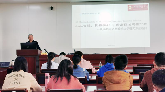 10月29日,中国社会科学院数量经济技术经济研究所研究员王国成在仙林校区德经楼307会议室作了题为“人工智能、机器学习与经济行为建模分析——从2019年诺奖看经济学研究方法趋向”的讲座。讲座由经济学院统计学学科带头人白先春主持,经济学院中青年教师和部分研究生参加讲座。本次讲座也是经济学院统计学科建设江苏省重点(培育)学科的组成部分。