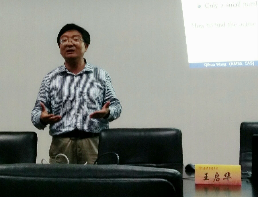 报告中,王启华教授针对在响应变量缺失的情况下,提出了超高维数据的变量筛选方法。基于“缺失示性变量插补方法”、“韦恩图插补方法”以及基于“完全数据方法”的变量筛选方法,在相应的假设条件下,证明了它们的“sure independent screening”性质,并通过随机模拟比较了这些方法的优劣。这些方法能十分简便地将完全观测数据下的“model-free”变量筛选方法引入到带缺失响应变量的观测数据中,代表了当前国际上该领域最前沿的学术成果。报告结束后,王启华教授与会师生进行了交流。