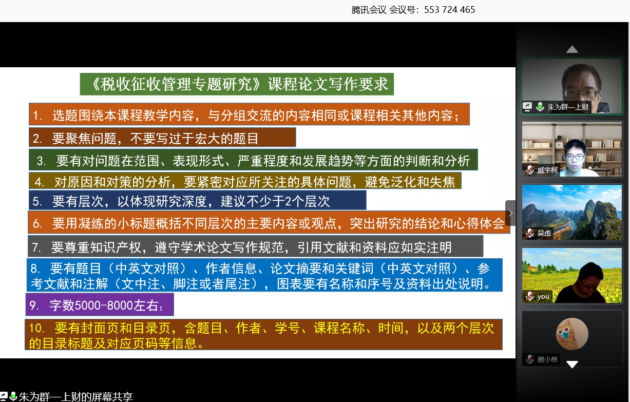 朱为群教授在报告中明确了税务硕士学位论文选题应聚焦税务领域的现实与前瞻性问题,并从可行性、创新性、研究价值等角度阐述了选题的基本要求,并就论文开题介绍了开题报告、文献综述的具体写法以及论文框架的构建问题,对正文写作中的引言构思、小标题凝练、论证要求和后记致谢写法等方面进行了全面阐述。最后,朱为群教授对论文答辩技巧作了经验分享。