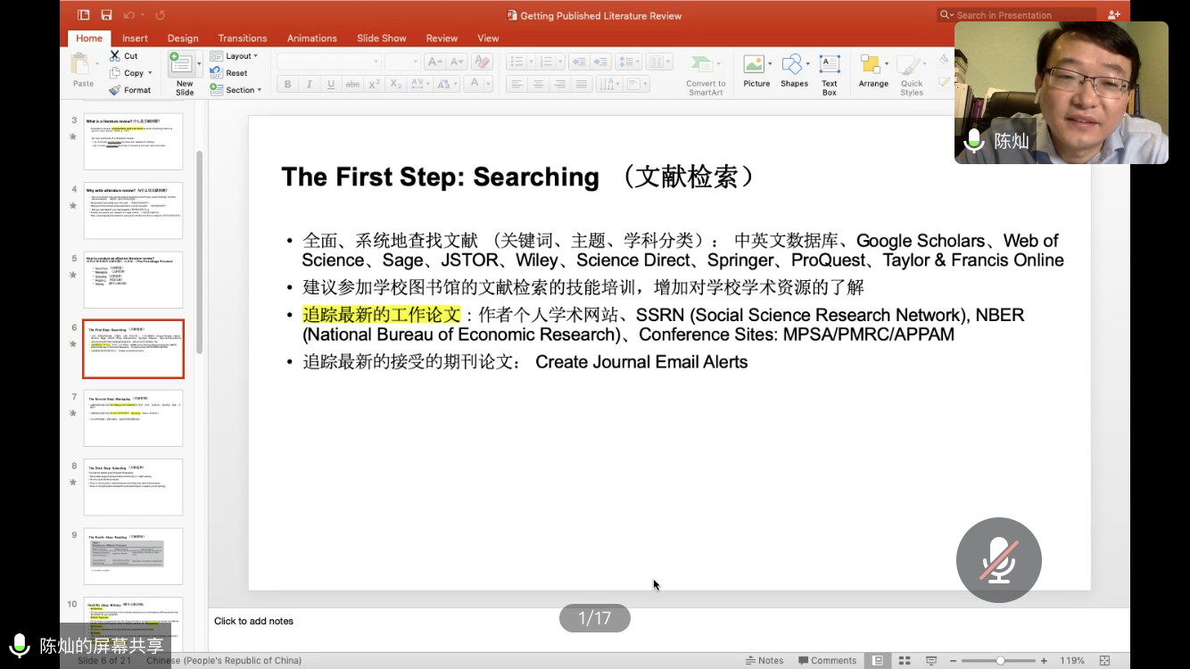 程韶明副教授和陈灿助理教授共同作了题为“Getting published——Topic and literature review”的学术报告。程韶明副教授介绍了英文期刊论文不同类型以及定量和定性研究文章的发展现状和趋势,并分享了他关于如何选择适当写作类型的建议。其次,他建议教师要强化文献阅读能力、保持对现实世界发展的敏锐度。最后,程韶明教授厘清了对“讲好中国故事”这一过程的理解误区以及如何培养相关能力。陈灿助理教授具体阐述了开展有效文献回顾的五步法,重点包括进行有效文献管理的常用工具、高效选择文献的要点、以目标为导向的文献精读方法、撰写文献综述的四要素,解释了“系统性论述”的重要概念,并以自身经历为例,分享了自己在投稿过程中收获的宝贵经验和教训。