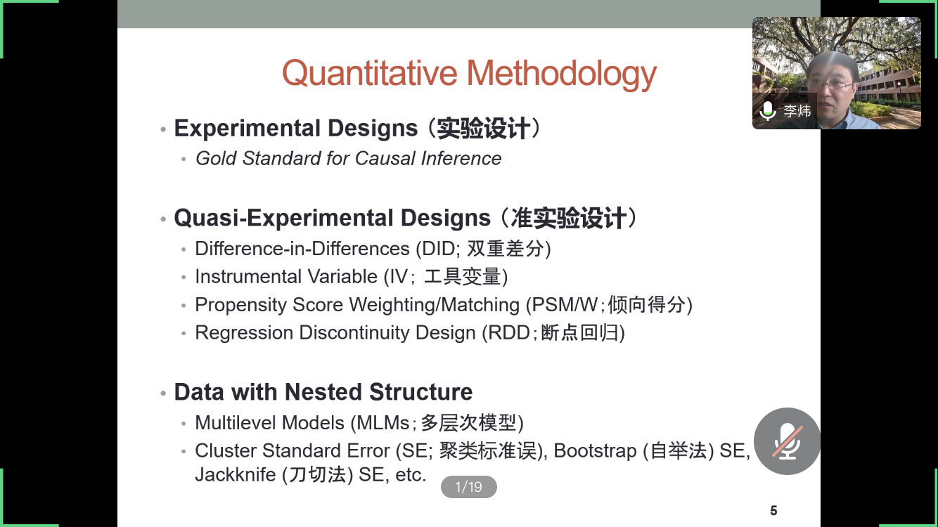 李炜教授介绍了自己的学习经历、专业背景及研究方向,并以2019年诺奖RCT为切入点,利用中、美、欧洲多国数据系统探讨了教育经济学领域的经典议题:班级规模与学生成绩的关系。最后,李炜教授通过分享个人学术成果为老师们提供了宝贵的研究经验,并从研究方法和数据使用层面展开了专业、高效的交流和分享。