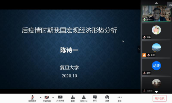 10月21日晚,应财政与税务学院、公共财政研究中心邀请,复旦大学经济学院党委书记、复旦大学泛海国际金融学院党组织书记、复旦大学可持续发展研究中心主任、香港中文大学和复旦大学共建的沪港发展联合研究所联席所长、复旦大学生态环境人文社科领导小组联合组长,博士生导师陈诗一通过腾讯会议,为金年会师生作了题为“后疫情时期我国宏观经济形势分析”的线上学术讲座。金年会部分教师和硕士研究生聆听了讲座。