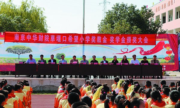 朱老师经过与民建江苏省委员会相关领导的协商,最终选择了苏北的一所贫困小学———盐城市建湖县草堰口希望小学(现名南京中华财院草堰口希望小学)。“还记得十年前刚去这所学校的一个冬天,我看见很小的孩子穿着单薄的衣裤瑟瑟发抖,脚趾都露在外面,当时很受触动,觉得自己有责任改变他们的生活”,讲到这里朱老师显得很激动。1999年,朱老师所在的南京中华财经进修学院捐赠20万元作为援建启动资金。之后,他每年都会来到这所小学给予固定的资金援助。他还在该小学设立了奖教金、奖学金,奖励优秀的老师和学生。10多年过去了,奖金总额已达30多万元。“设立奖教金、奖学金主要是为了提高老师和孩子们的积极性,希望更多的老师能够留下来提升教学水平,让孩子们能拥有更好的教育环境。”朱老师说。